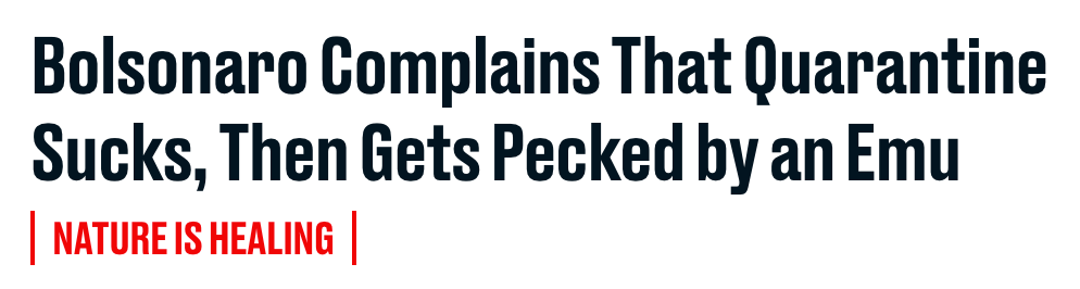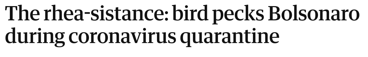 A few weeks ago, a heroic rhea (South America’s ostrich) attacked the president of Brazil, Jair Bolsonaro. Bolsonaro is the super-right-wing guy who wants to chop down the rainforest and is an asshole about pretty much everything else, too. He also thought that coronavirus wasn’t much of a threat to him or his country. Brazil is now one of the worst-hit countries in the world and Bolsonaro got coronavirus, too. So that worked out great.