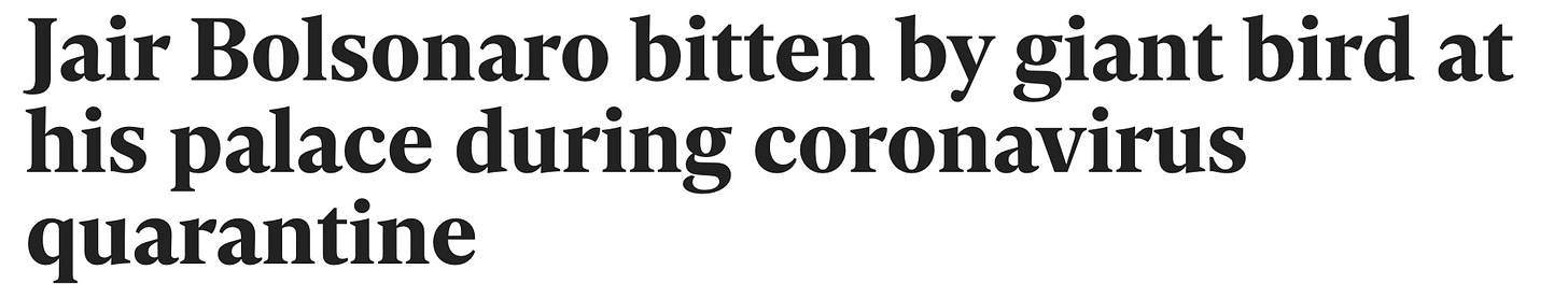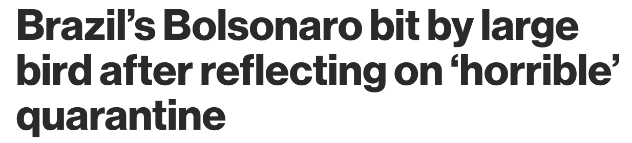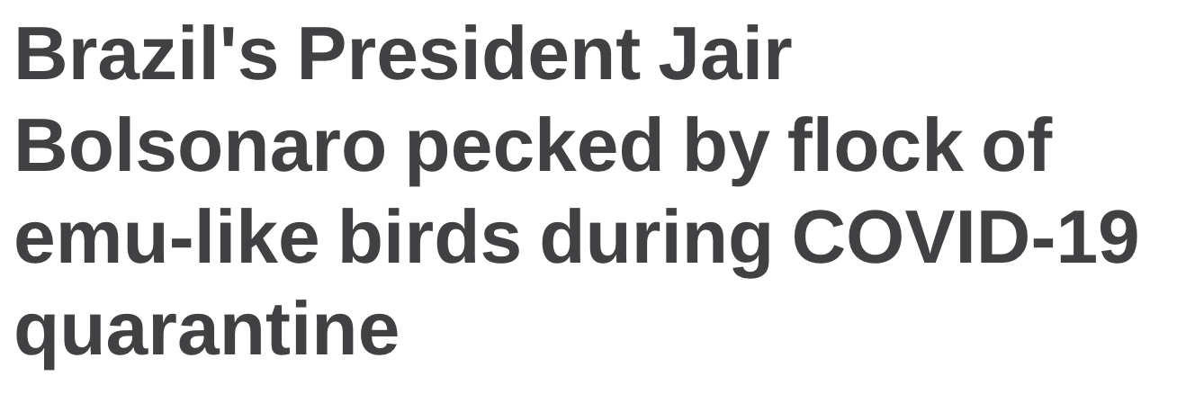 While Bolsonaro was holed up in his palace being sick and chomping on hydroxycholoroquine pills, he decided to go for a walk and feed the flock of rheas (FUN FACT: a group of emus is called a “mob,” but that doesn’t apply here because rheas are NOT EMUS) that hang out there, I guess? They bit him.